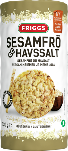 Friggs Majskaka Sesamfrö & Havssalt är en tunn och krispig majskaka med en nötig smak av sesamfrö och havssalt. Perfekt som ett mellanmål, att äta precis som den är eller tillsammans med ditt favoritpålägg.