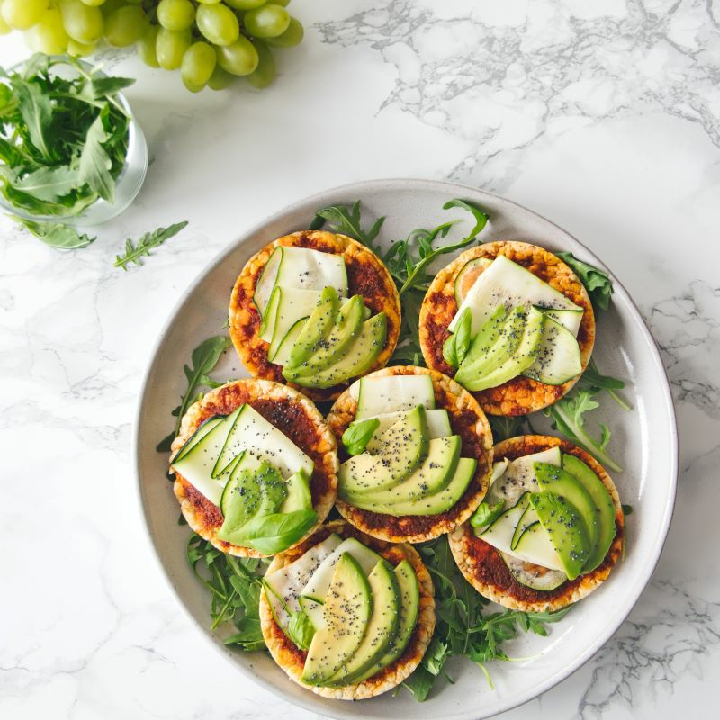 Majskakor med avokado, zucchini och röd pesto